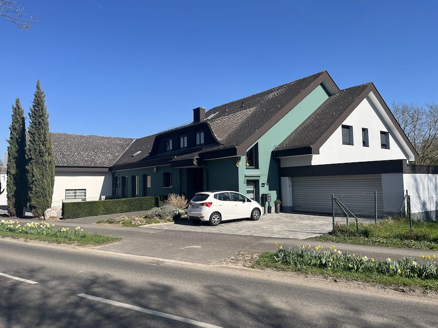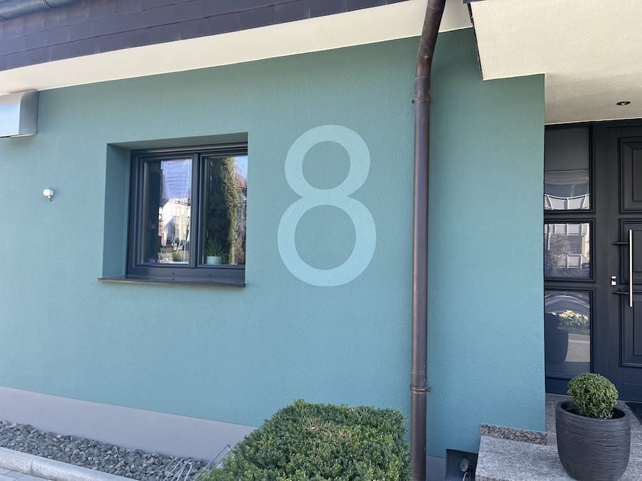 Auch im Eingangsbereich haben wir etwas verändert: Ein Fassadenstreifen an der Halle bringt mehr Struktur, wirkt einladender – und ganz nebenbei haben wir auch endlich unsere Hausnummer wieder aufgemalt. Sie war bei der letzten Renovierung irgendwie „verloren gegangen“. Jetzt prangt sie dezent, aber sehr präsent an der Wand.