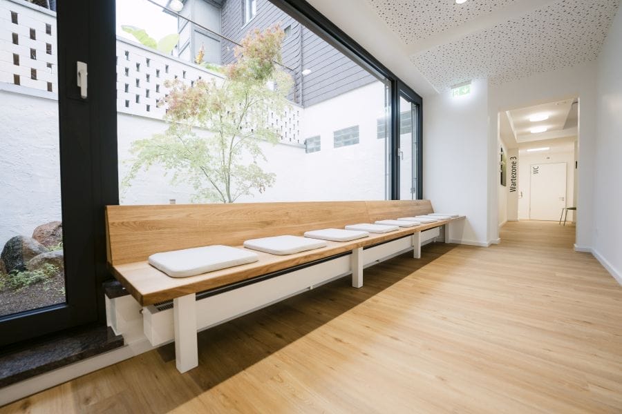 Die Toiletten und Bäder haben wir mit einer weißen, fugenlosen Beschichtung ausgeführt – hygienisch, modern und pflegeleicht.