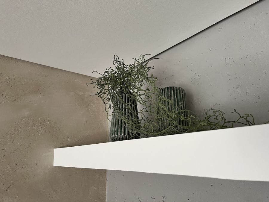 Die Gestaltung war von Anfang an klar durchdacht: Wir wollten Kalkputzflächen in der gesamten Wohnung – nicht nur wegen der Optik, sondern vor allem wegen des Raumklimas. Kalk reguliert Feuchtigkeit, wirkt antibakteriell und sorgt für ein angenehmes Wohngefühl – gerade in einem mediterranen Klima.